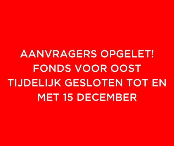 Initiatiefnemers met goede plannen voor de buurt: let op! In december is er geen beoordelingsronde bij Fonds voor Oost. Ook werken wij op dit moment aan een nieuw administratiesysteem. Wacht daarom tot ná 15 december 2020 met het doen van jouw aanvraag. Tot die tijd is ons aanvraagsysteem gesloten. Voor vragen zijn wij uiteraard gewoon bereikbaar. We ontvangen graag vanaf 16 december jullie plannen voor in het nieuwe jaar!