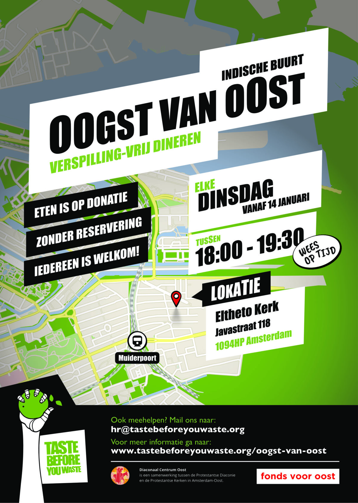 Zeven jaar geleden begon Taste Before You Waste (TBYW) in de Javastraat. Luana Carretto besloot na het zien van een documentaire over voedselverspilling om lokale winkels in de Javastraat te benaderen voor hun afgewezen overschot aan producten. Sindsdien is de TBYW gemeenschap behoorlijk gegroeid en wordt er wekelijks alleen in Amsterdam rond 250 kg aan eten gered. Nu begint een nieuw hoofdstuk want TBYW gaat – met ondersteuning van Fonds voor Oost – vanaf dinsdag 14 januari wekelijks Oogst van Oost, een Verspillings-Vrij Diner in de Javastraat (Elthetokerk Amsterdam) beginnen. En iedereen is welkom! Ze zijn nog op zoek naar vrijwilligers die een handje willen komen helpen met koken (13:30 – 17:30) of serveren (18:00-20:30) in ruil voor een lekkere maaltijd en veel gezelligheid. Ben je geïnteresseerd, stuur dan snel een email naar hr@tastebeforeyouwaste.org!
